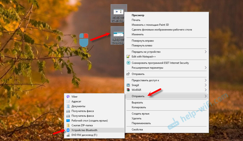 Убедитесь, что Bluetooth на смартфоне включен и доступен для поиска. В Windows 10 выделите файл, или несколько файлов и нажмите на них правой кнопкой мыши. Выберите «Отправить» – «Устройство Bluetooth».