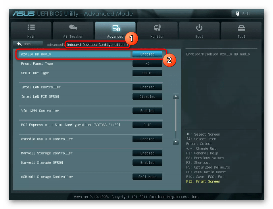Звуковая панель осуществляет работу согласно устаревшему стандарту AC97, представленному миру компанией Intel еще в 1997 году, а звуковая подсистема материнской платы функционирует по новому стандарту HD. Поэтому фронтальное аудиоустройство на компьютере может не работать. Для устранения неисправности нужно перейти в BIOS и следовать алгоритму пунктов: