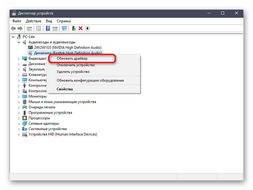 После вышеописанных манипуляций наушники заработают. Ещё одна причина, почему компьютер не видит наушники, – отсутствие драйвера. Требуется запустить диспетчер устройств. Удостовериться в наличии аудиодрайвера.