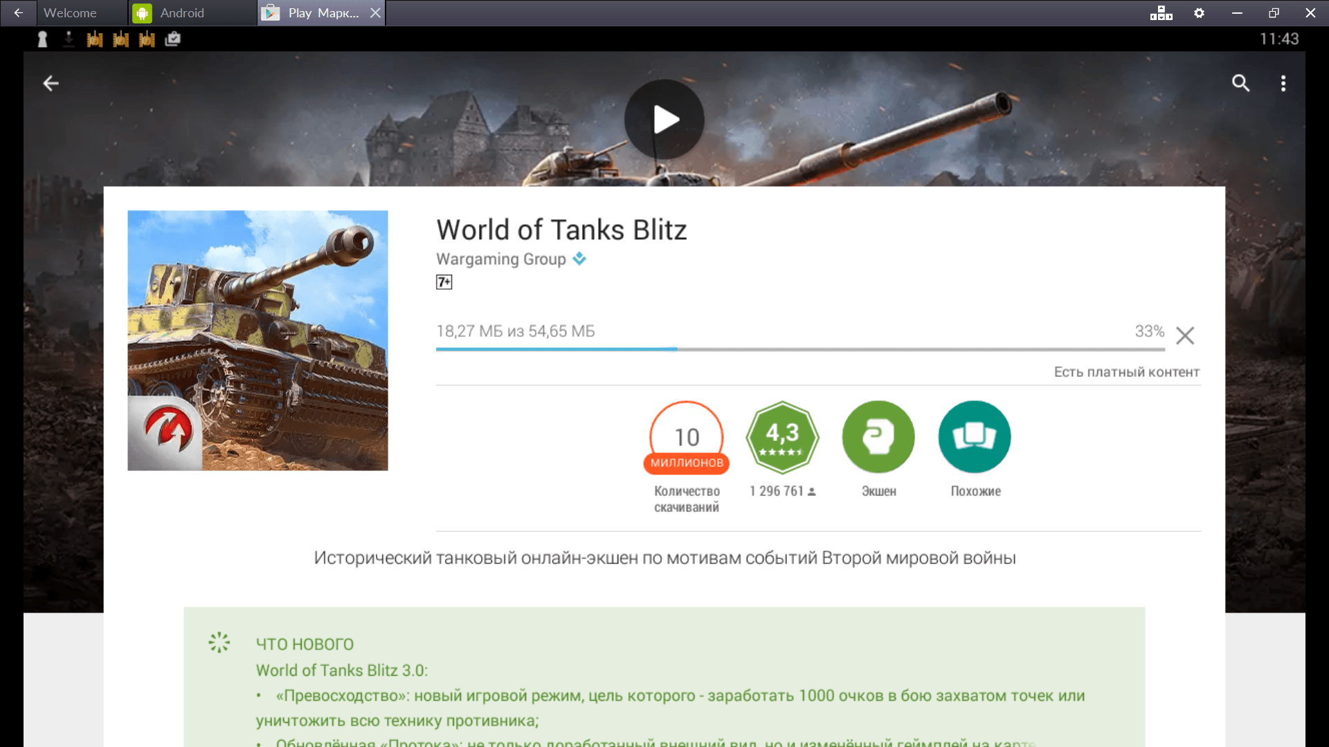 После авторизации находим приложении World of Tanks Blitz и устанавливаем его, делается это через уже имеющийся Play Маркет на BlueStacks.