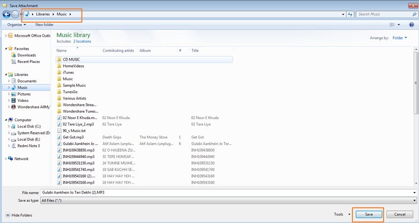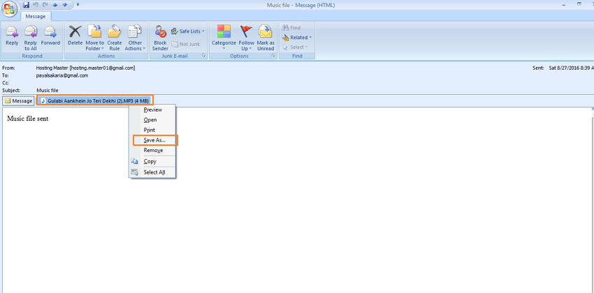 Шаг 2. Откройте почтовый идентификатор, на который был отправлен музыкальный файл на вашем ПК. Щелкните правой кнопкой мыши вложение и сохраните музыкальный файл в нужном месте на ПК.