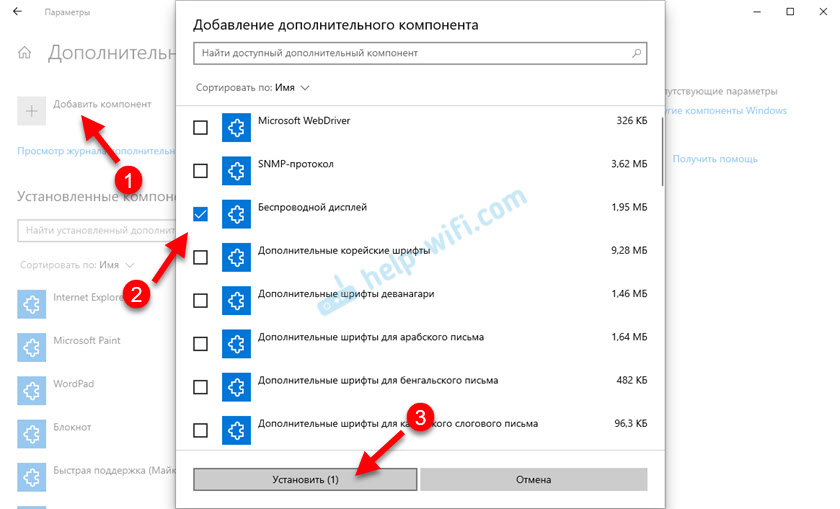 Решение – установить компонент «Беспроводной дисплей». Нажмите на «Дополнительные компоненты» (выделен голубым цветом, смотрите скриншот выше). Затем нажмите на «Добавить компонент», поставьте галочку возле «Беспроводной дисплей» и нажмите на кнопку «Установить».