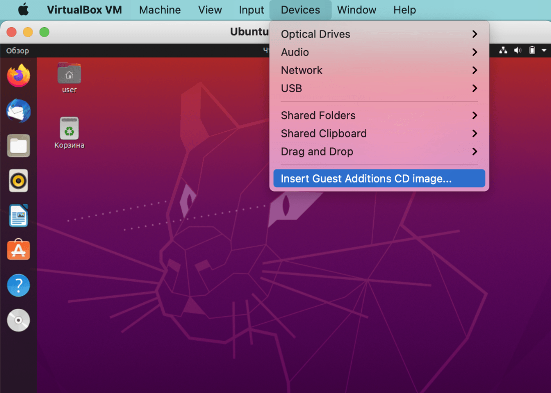 Установите дополнения для гостевой ОС. Если вы используете хостовую систему macOS, в верхнем меню выберите «Devices» и нажмите Insert Guest Additions CD image: