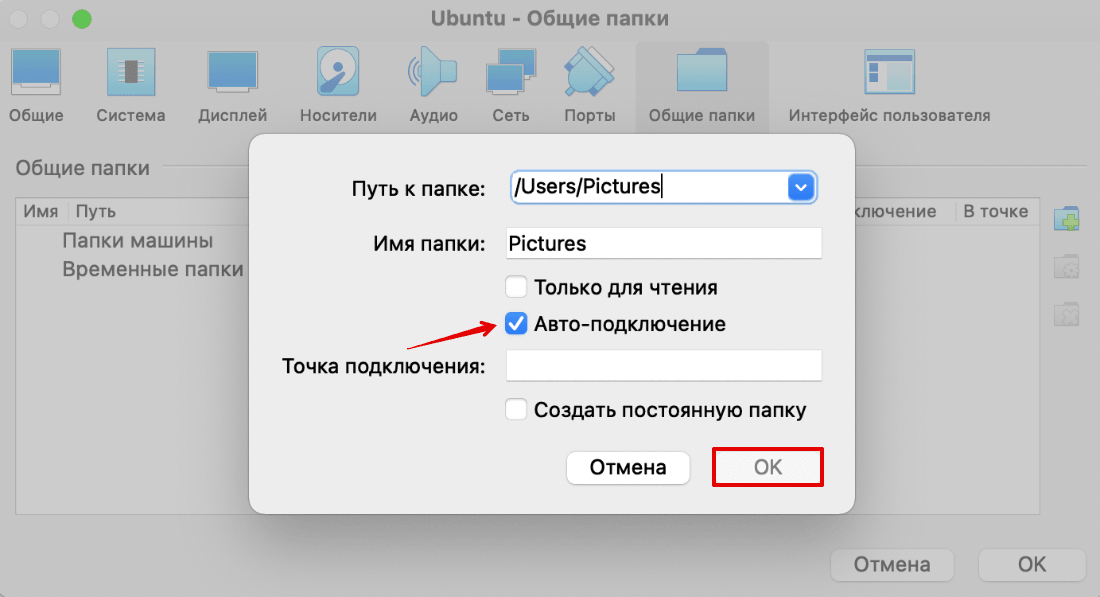 Выберите папку, которую хотите добавить в гостевую ОС. Чтобы постоянно не настраивать обмен папками, поставьте галочку напротив Авто-подключение. Нажмите ОК: