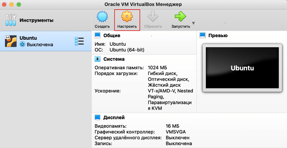 Добавьте папку, данные которой хотите использовать на гостевой операционной системе, в настройки виртуальной машины. Для этого выберите нужную виртуальную машину и нажмите Настроить:
