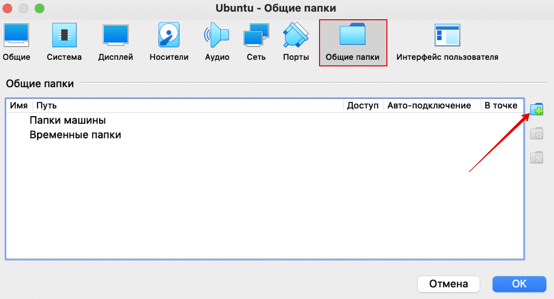 Перейдите во вкладку «Общие папки» и нажмите на значок папки с плюсом: