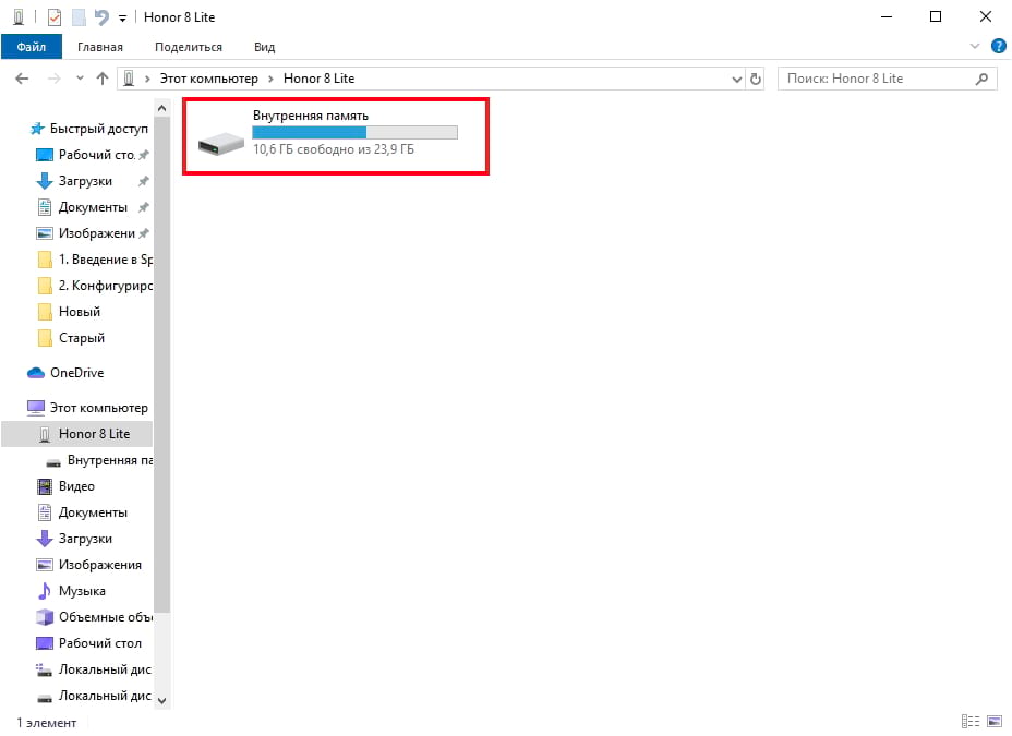 3. Или можно зайти в «Мой компьютер». В списке дисков появится новый диск – «Внутренняя память» или «Память телефона». Также может появиться диск «SD-карта» или название смартфона, как на скриншоте ниже: