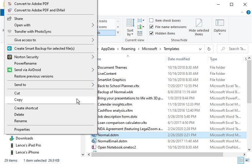 5. Open File Explorer or Windows Explorer, and navigate to C:UsersAppDataRoamingMicrosoftTemplates. (If the AppData folder doesn’t appear, click the View tab, and check the box for Hidden Items.)