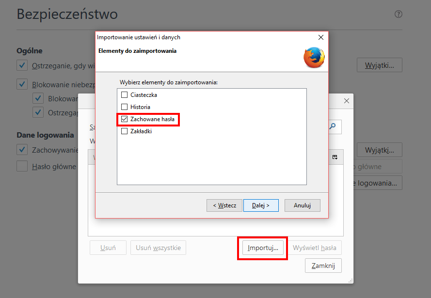 Нажмите эту кнопку. Появится новое окно, в котором вы сможете просматривать сохраненные пароли в Firefox. Конечно, здесь будет пусто. Нажмите кнопку «Импорт», чтобы импортировать пароли из другого браузера.