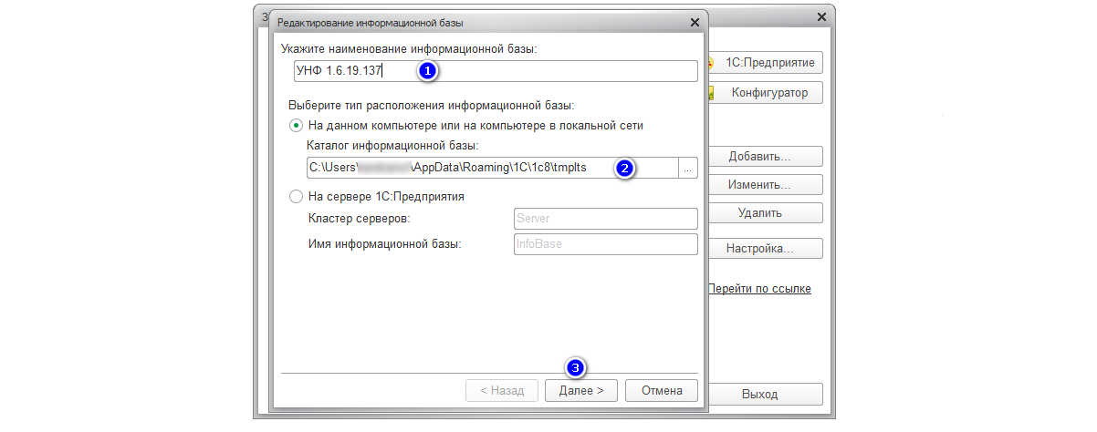Рис.8. Создание базы без конфигурацииУкажите название базы, в блоке «Выберите тип расположения…» ничего не меняйте и нажмите «Далее».
