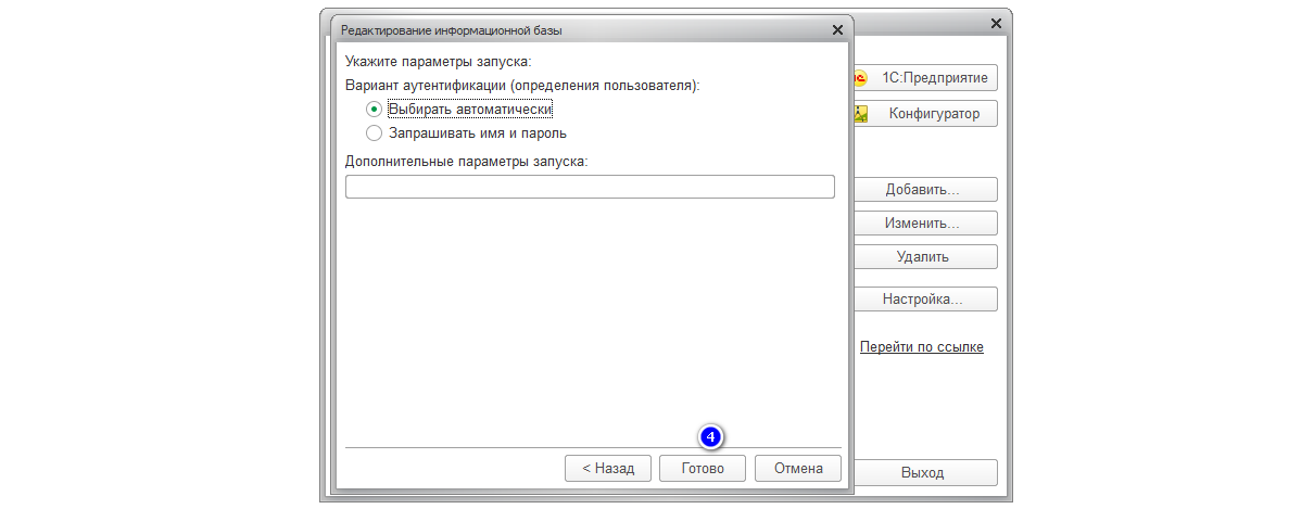 При отсутствии каталога, «1С:Предприятие 8» самостоятельно создаст его при необходимости. Конечным пунктом является окно настроек запуска. Если параметры ваc устраивают, то нажмите «Готово». База теперь в списке.
