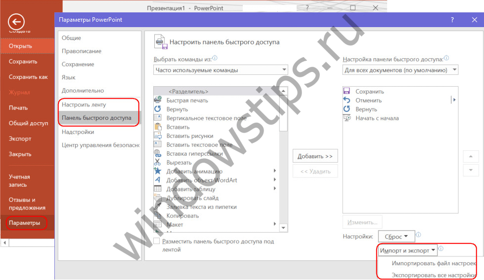 Функция экспорта-импорта данных в приложениях пакета Microsoft Office реализована в меню «Файл», в разделе «Параметры». Настроенные для удобства в работе вкладки ленты меню и панель быстрого доступа в подразделах, соответственно, «Настроить ленту» и «Панель быстрого доступа» экспортируются в специальный настроечный файл, а затем могут быть импортированы после установки Microsoft Office на переустановленной Windows.