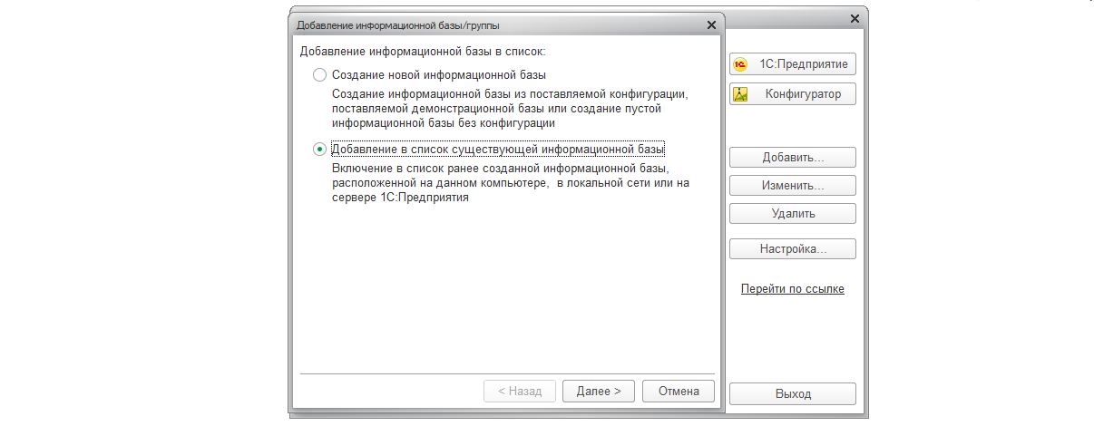 Далее выберите «Добавлению в список существующей ИБ», так как база уже существует.
