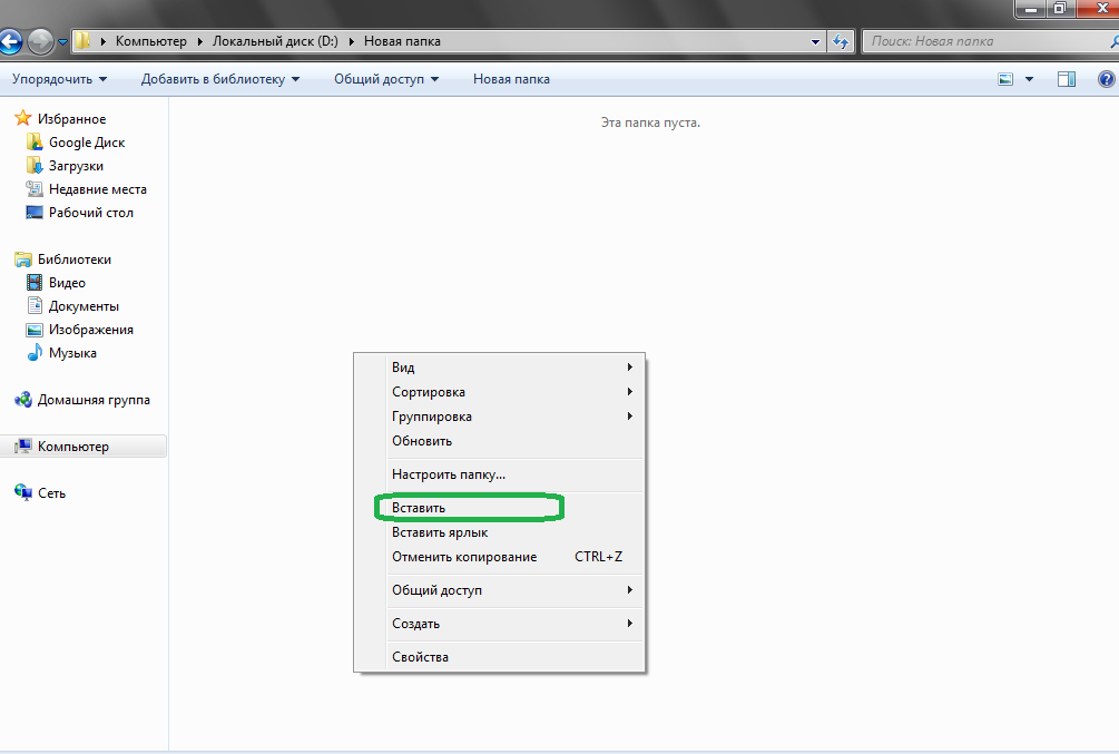 - Перейти в нужную папку на компьютере, нажать ПКМ на свободное место и выбрать Вставить.