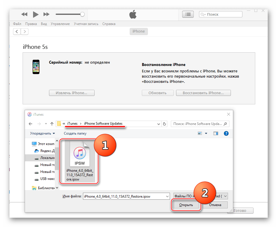 Открывается окно Проводника, в котором необходимо указать путь к прошивке. Отметив файл *.ipsw