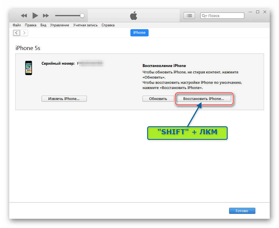Выполнив подготовку и загрузив желаемый к установке пакет с прошивкой, можно переходить к непосредственным манипуляциям с памятью девайса. Существует всего два метода прошивки iPhone 5S, доступных обычному пользователю. Оба предполагают использование iTunes в качестве инструмента для установки ОС и восстановления.