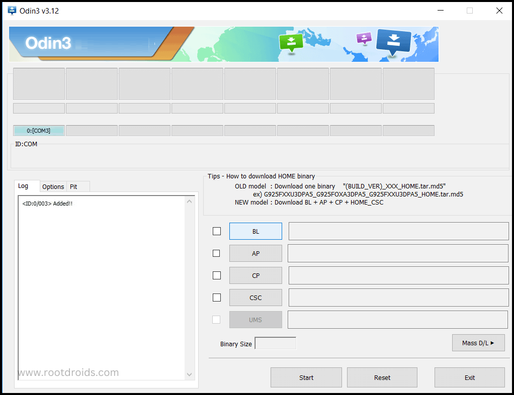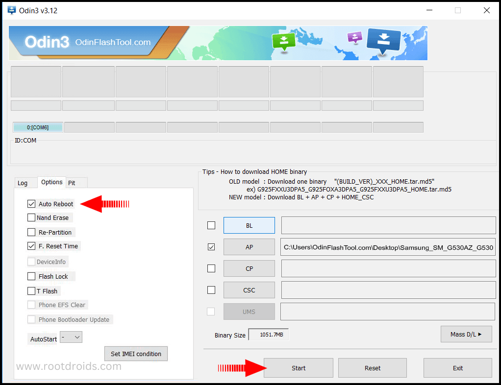 - Click PDA / AP and browse to Downloaded CF Root file.