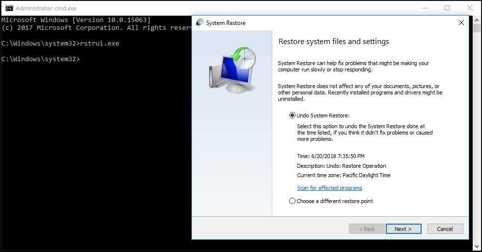 Шаг 7: Тип rstrui.exe во всплывающем окне командной строки и нажмите Войти .