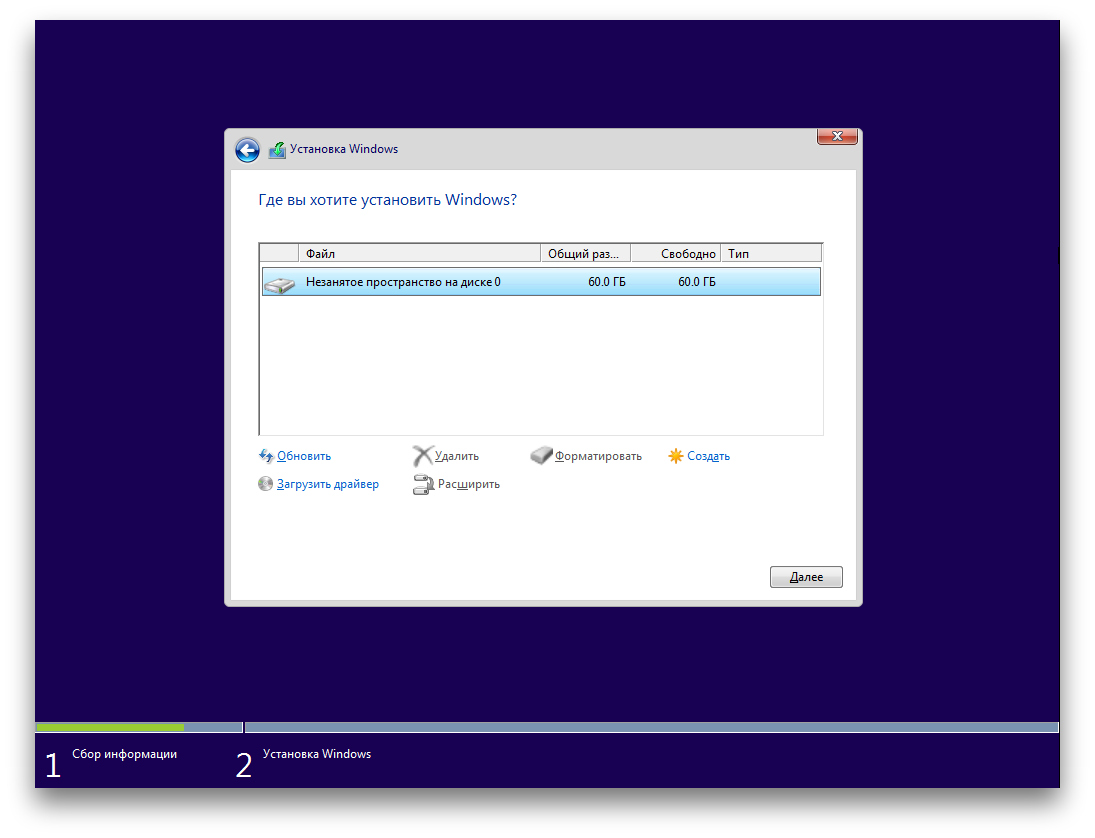 Если за компьютером работают несколько человек, то политика разбивки у меня следующая: системный раздел 100-200 ГБ (200 так как будут хранить документы на диске С); и один общий раздел с фильмами, фотографиями и другим медиа-контентом, все оставшееся место. Так же при создании НЕ системного раздела есть функция форматировать, использование которой кажется более рационально нежели производить форматирование в установленной системе. Разбиваем диск под ваши требования и нажимаем Далее