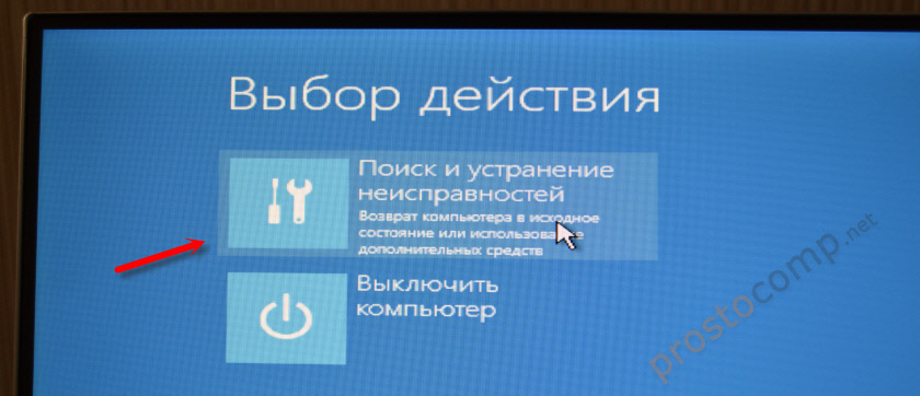 На экране «Выбор действия» в среде восстановления щелкните мышкой по пункту «Диагностика».