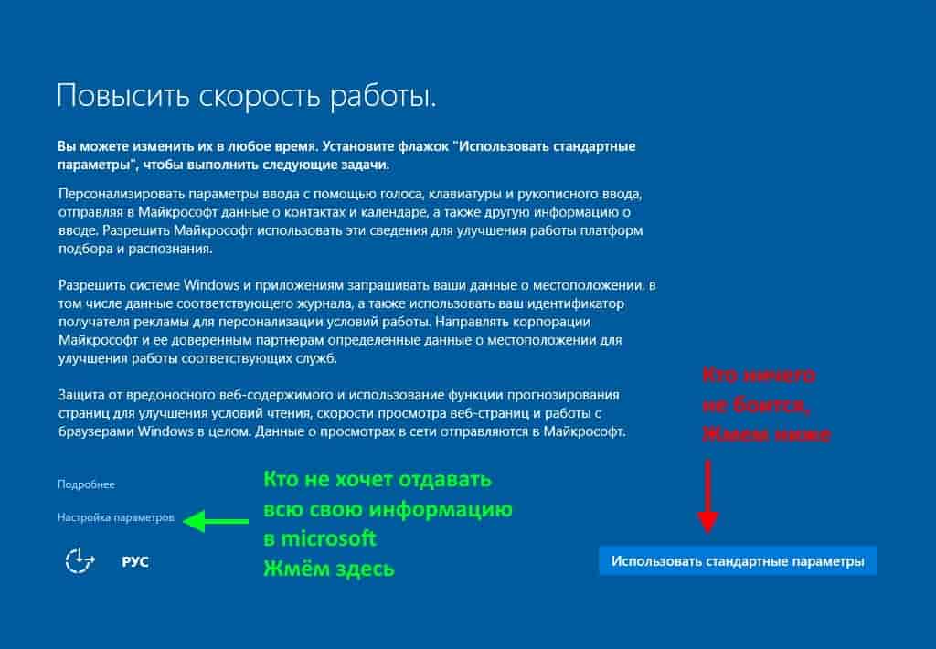После перезагрузки системы, на экране высветится окно для настройки параметров. Все указанные параметры рекомендуется отключить , чтобы не заниматься этим вручную, можно кликнуть на пункт «Использовать стандартные параметры».