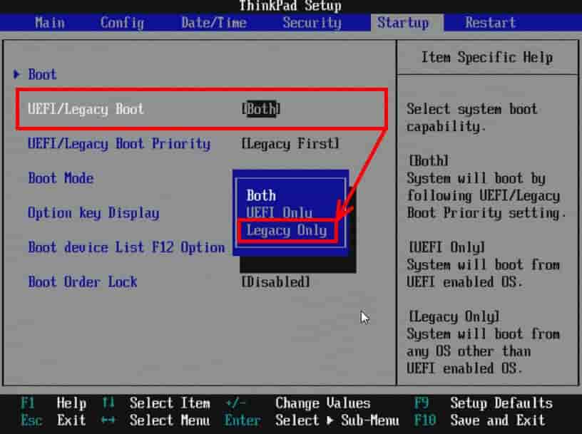 Теперь нужно обязательно включить режим совместимости с другими операционными системами. Поскольку мы говорим о Lenovo, вам необходимо включить поддержку устаревших версий. Для этого перейдите на вкладку Boot. Если вы посмотрите на первую строку этой вкладки, вы увидите режим загрузки, как на изображении ниже.