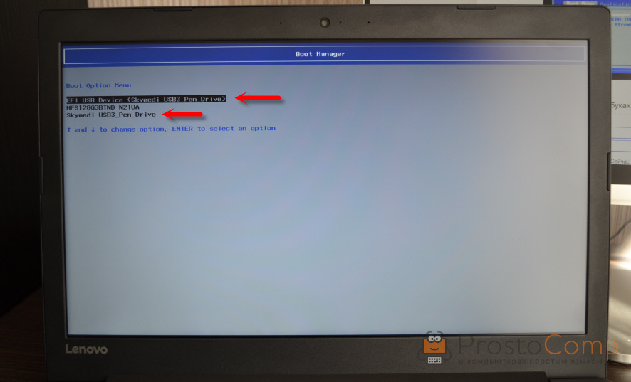Как видите, в моем случае, в загрузочном меню ноутбука Lenovo отображается два USB накопителя. Один с надписью «EFI USB Device». Попробуйте для начала выбрать тот накопитель, который без EFI (на скриншоте он в самом низу). Это если вы собираетесь устанавливать Windows 10. Иначе могут быть проблемы с установкой Windows 10 на MBR-раздел.
