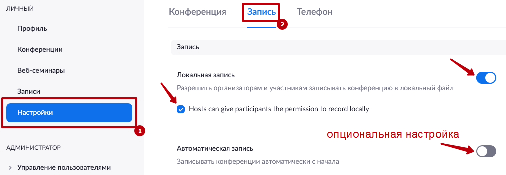 Чтобы разрешить организатору и участникам записывать семинар, переведите ползунок «Локальная запись» во включенное положение и установите размещенный ниже флажок. Если хотите включить автоматическую запись конференции, активируйте настройку «Автоматическая запись».