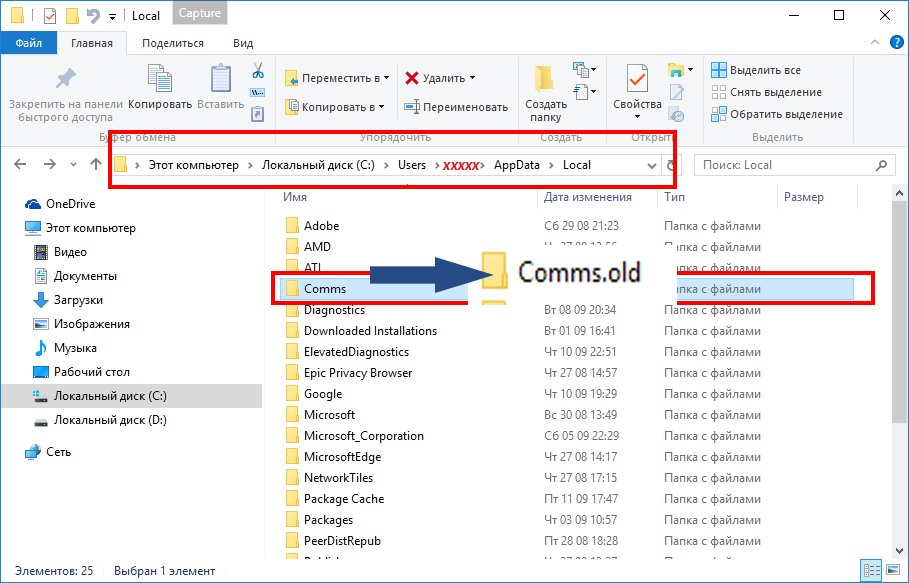 Затем в папке Local (находим ее по пути C:\Users\имя пользователя\AppData) следует переименовать «фолдер» под названием Comms на Comms.old. После редактирования названия перезагрузите компьютер.