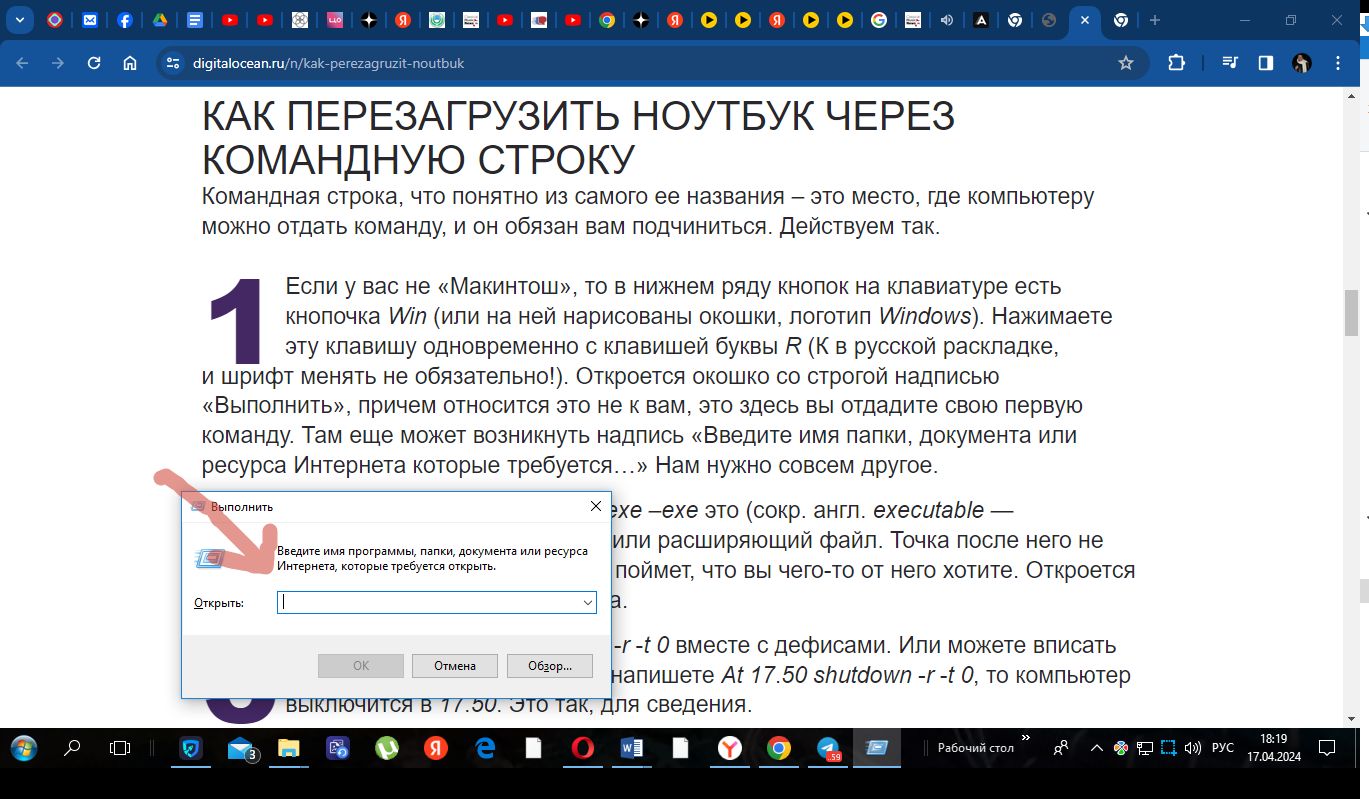 — И вот тут вы пишете shutdown —r —t 0 вместе с дефисами. Или можете вписать команду shutdown /r /t 0. Если напишете At 17.50 shutdown —r —t 0, то компьютер выключится в 17.50. Это так, для сведения.