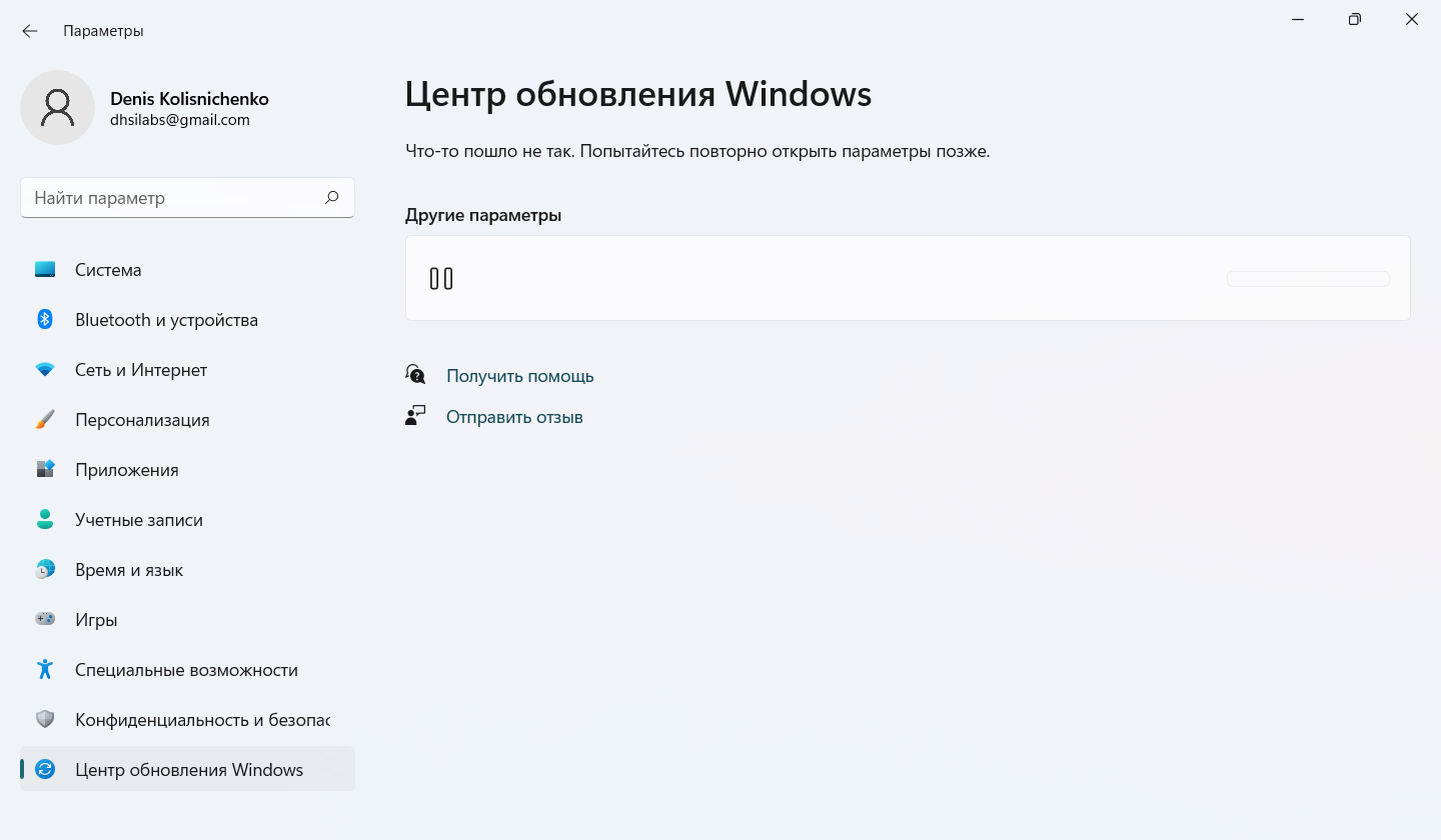 - Открой окно «Параметры» и перейди в раздел «Центр обновления Windows», чтобы убедиться, что обновления выключены. Ты должен увидеть сообщение, что «что‑то пошло не так». Хотя в Windows 10 в этом случае было уведомление о том, что обновлениями управляет организация. Но в любом случае цель достигнута.