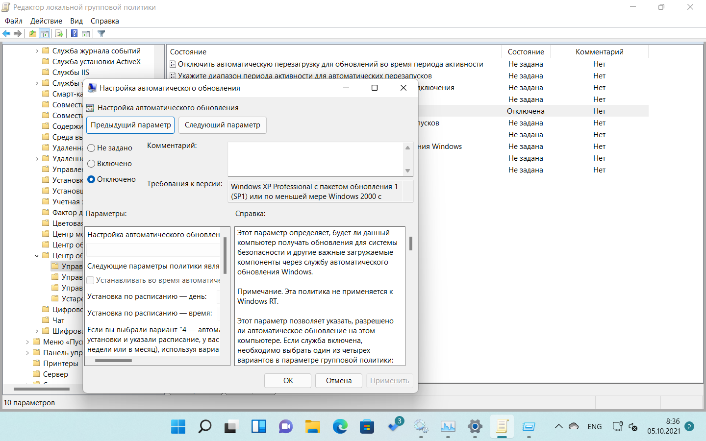 - В разделе «Управление обновлениями Windows» включите параметр «Отключить автоматическое обновление системы (Windows-Update)».