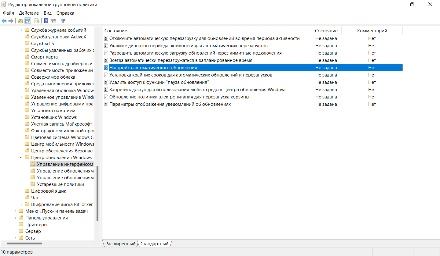 - Перейди в раздел «Конфигурация компьютера → Административные шаблоны → Компоненты Windows → Центр обновления Windows → Управление интерфейсом пользователя» и найди политику «Настройка автоматического обновления».
