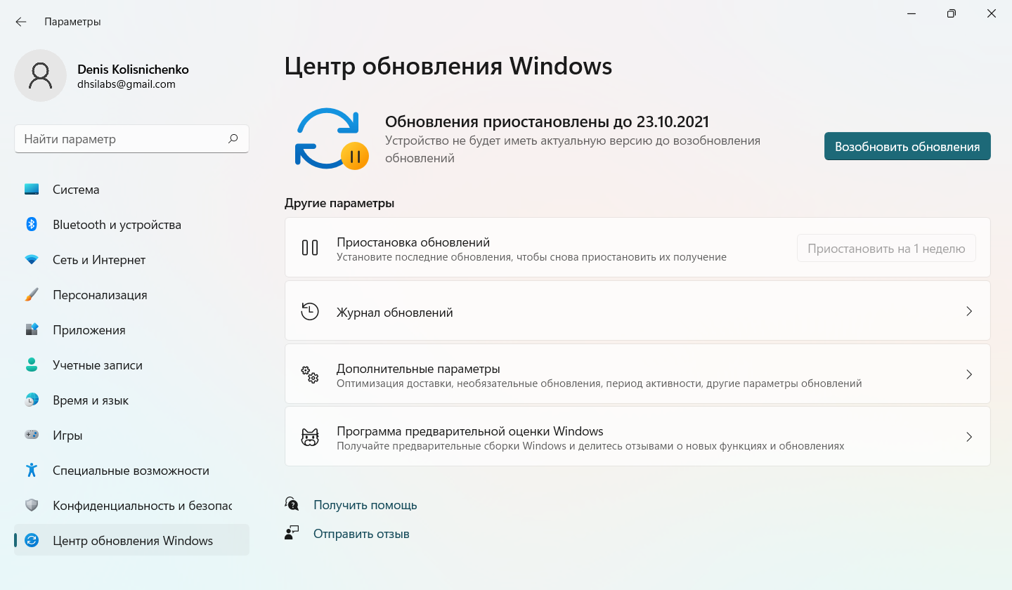 Экран «Параметры, Центр обновления Windows» позволяет управлять обновлениями системы. Например, пользователь может приостановить обновления на некоторое время. Для их возобновления раньше указанного периода используется кнопка «Возобновить обновления».