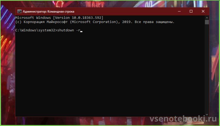 Возможно осуществить перезагрузку ноутбука при помощи использования командной строки. Этот метод может быть полезен, если перезапуск через меню «Пуск» или путем сочетания клавиш не является эффективным для решения проблемы.