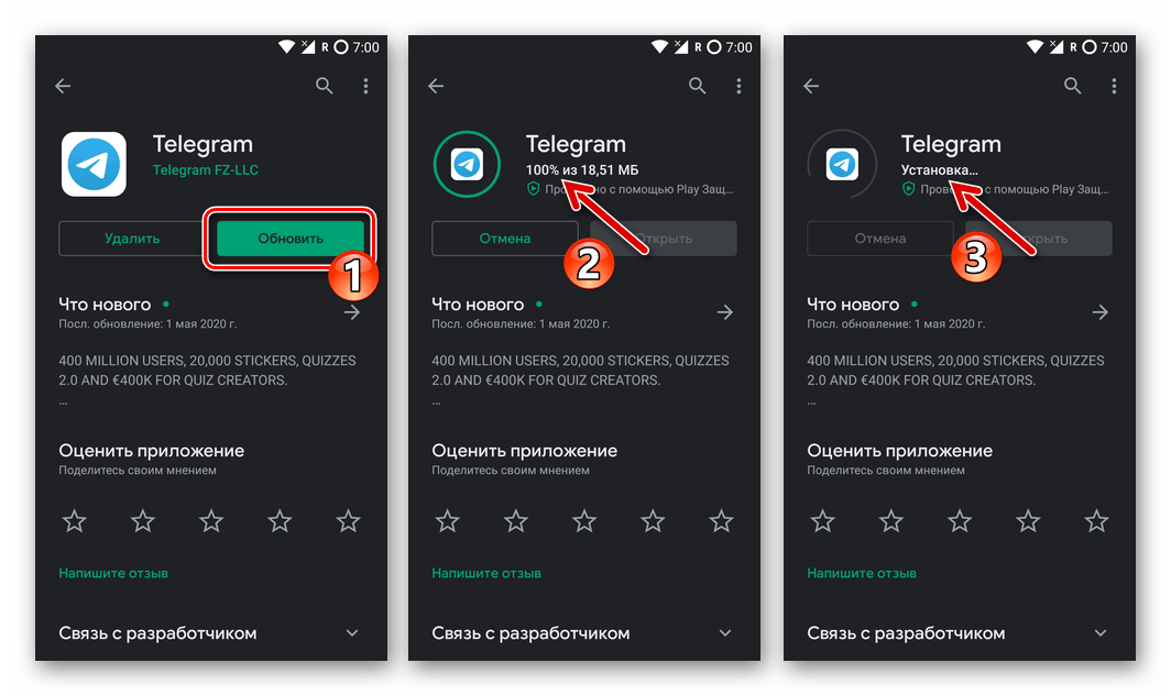 Как и в случае с рассмотренной выше Apple iOS, на Android обновление приложений осуществляется через встроенный в операционную систему магазин – Google Play Маркет. Имеется и альтернативный вариант — установка актуальной версии из APK-файла. Более подробно процедура апдейта мессенджера Telegram ранее была рассмотрена нами в отдельной статье.