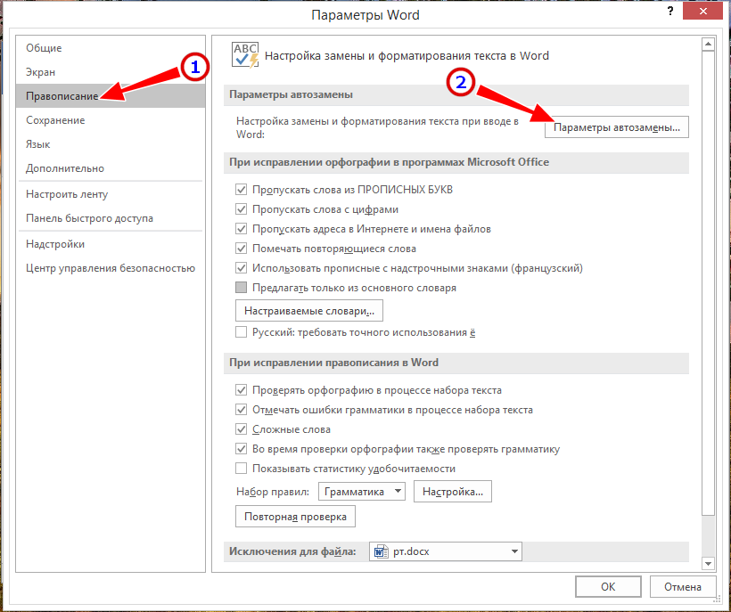 В окне настроек редактора переключитесь в раздел «Правописание» и нажмите кнопку «Параметры автозамены»;