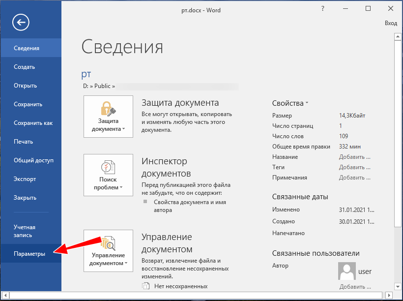 Файл», а затем выберите «Параметры»;