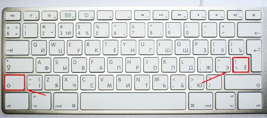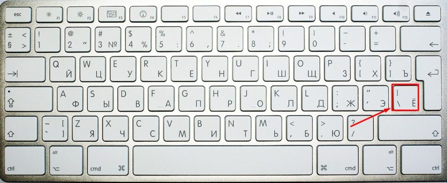 На клавиатуре от Apple пайпу соответствует клавиша русской Ё. Как и с Windows, для ввода вертикальной палочки на Маке надо сперва переключить раскладку на английский. В старых версиях для этого надо нажать cmd+пробел, а на новых — ctrl+пробел.