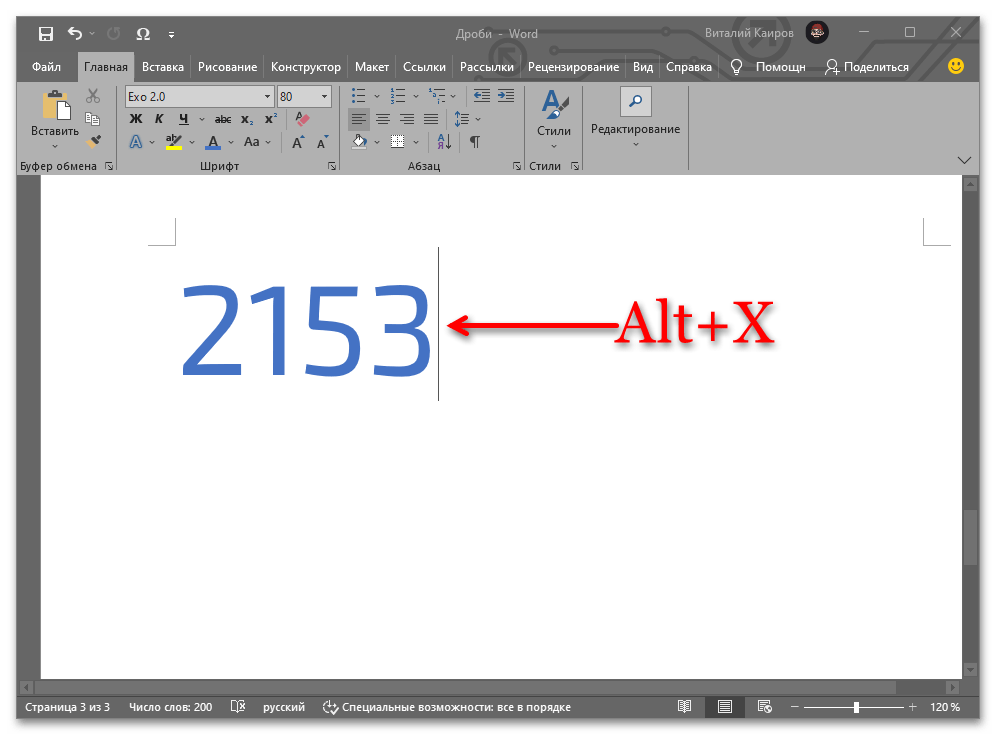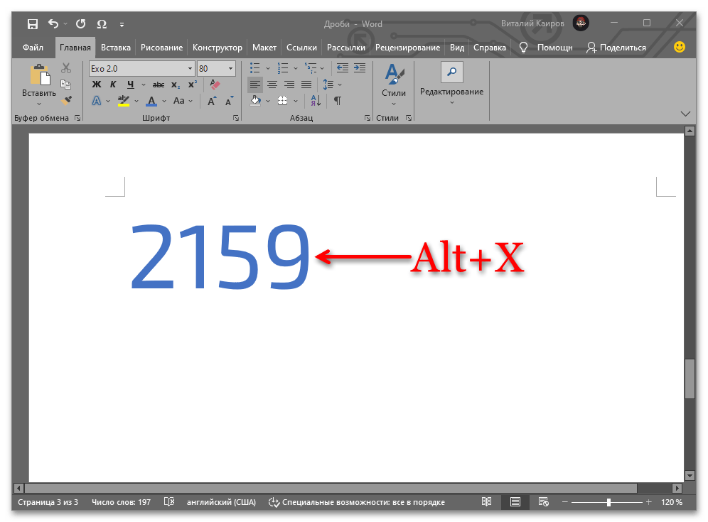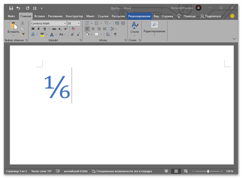Например, для получения записи ⅙ следует ввести и преобразовать комбинацией клавиш выражение 2159.