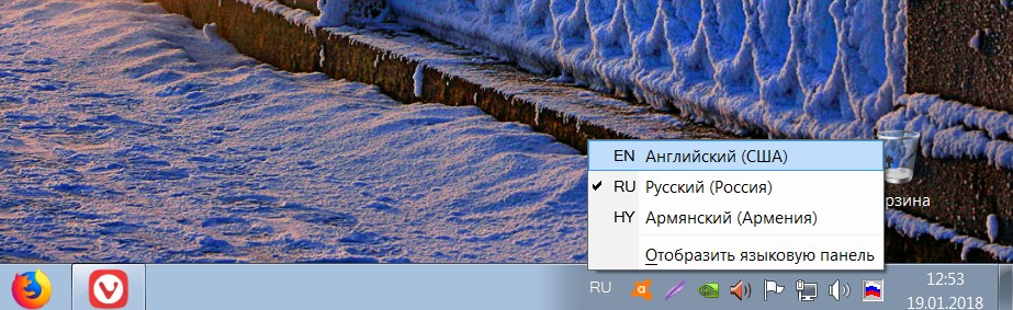- Левым кликом мыши открыть языковую панель и еще одним нажатием выбрать Английский Язык