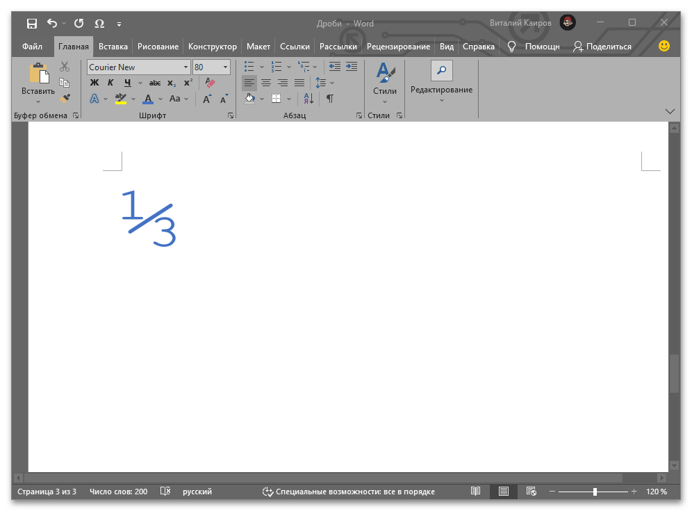 В базовом арсенале Microsoft Word содержится всего шесть знаков дробей со слеш-разделителем. Их добавление осуществляется по следующему алгоритму: