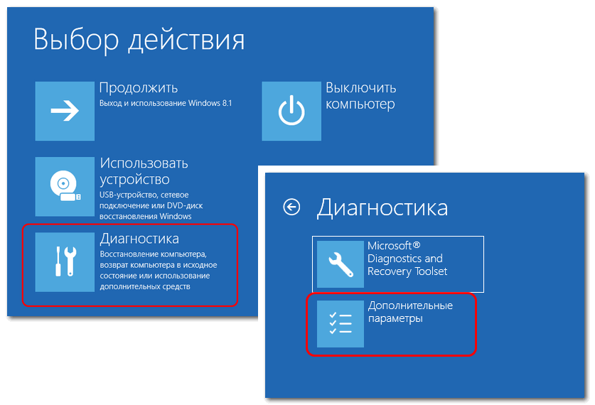 Все варианты доступа к среде восстановления с установочных носителей взаимозаменяемы, функционалу восстановления Windows из архива всё равно, какими путями его будут запускать. В общем, любым из предложенных способов заходим в среду восстановления. Если она в новом формате (меню выбора действия на синем фоне), а так будет во всех случаях, кроме запуска с установочного диска Win7, в меню выбираем раздел диагностики, далее же кликаем дополнительные параметры.