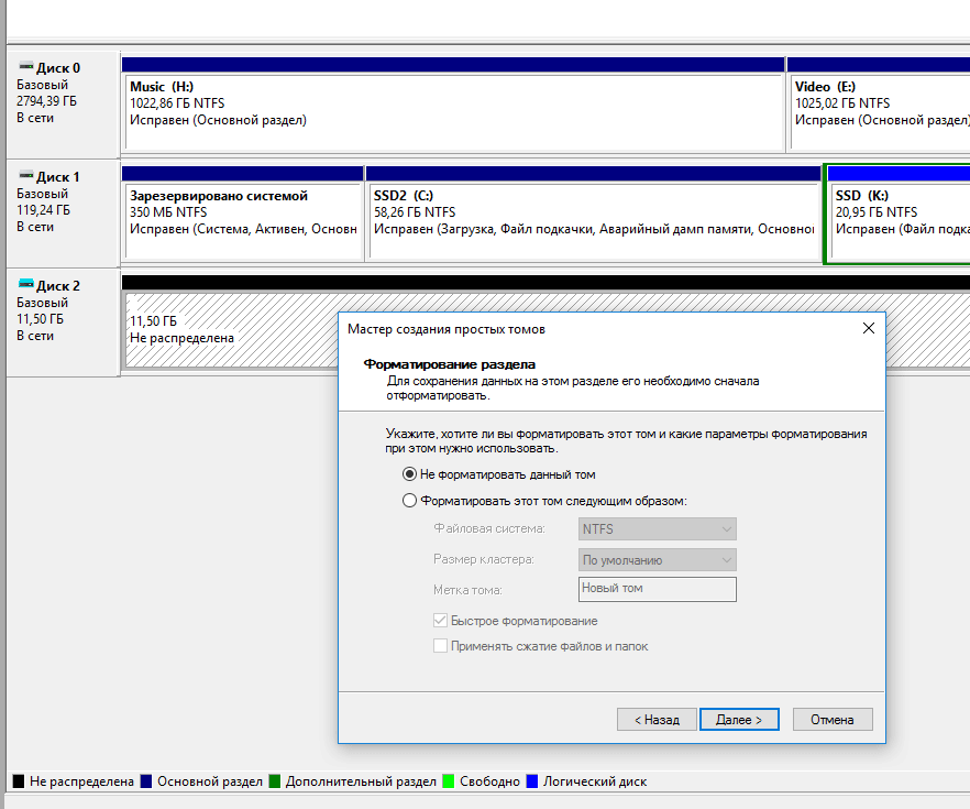В мастере настройки нажмите «Далее», оставьте настройки по умолчанию для размера, Далее, выберите букву диска (K, например), Далее. Убедитесь, что не активировали опцию Не форматировать этот раздел, Далее, Завершение.